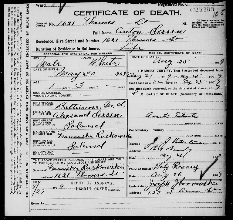 As part of my tree do over, I’ve been spending some time in the Maryland State Archives, looking through indexes of deaths in the city between 1906 and the mid 1920s. These records aren’t searchable, so the only way to research is to go page by page, scanning for a Sersen surname (or a plausible mispelling, given how many there are in other documents). It can be a chore, and I’ve done this a couple times now, looking for a sign of either Aleksander or Jan. So far I’ve come up empty.